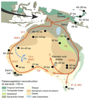 The peopling of Australia. Genetic groups given by letters. Ages shown as thousands of years ago (ka). Source: Tobler et al., Nature.