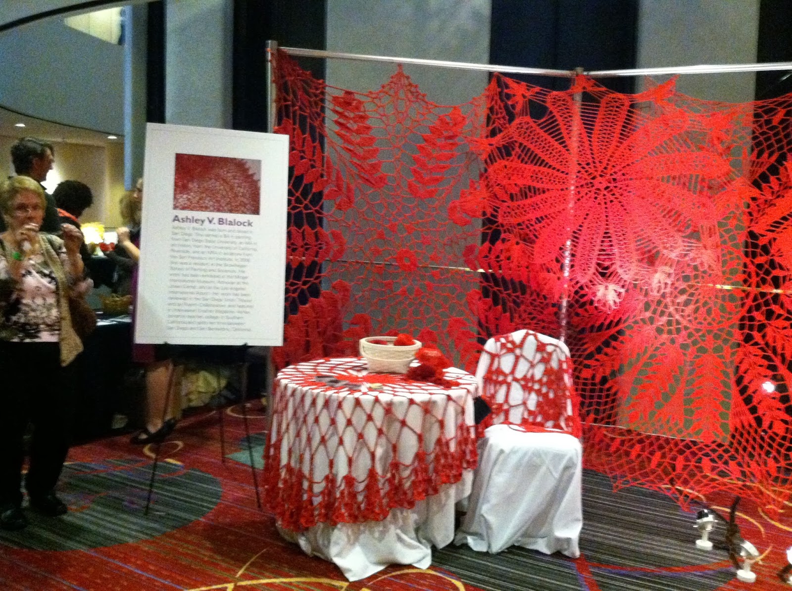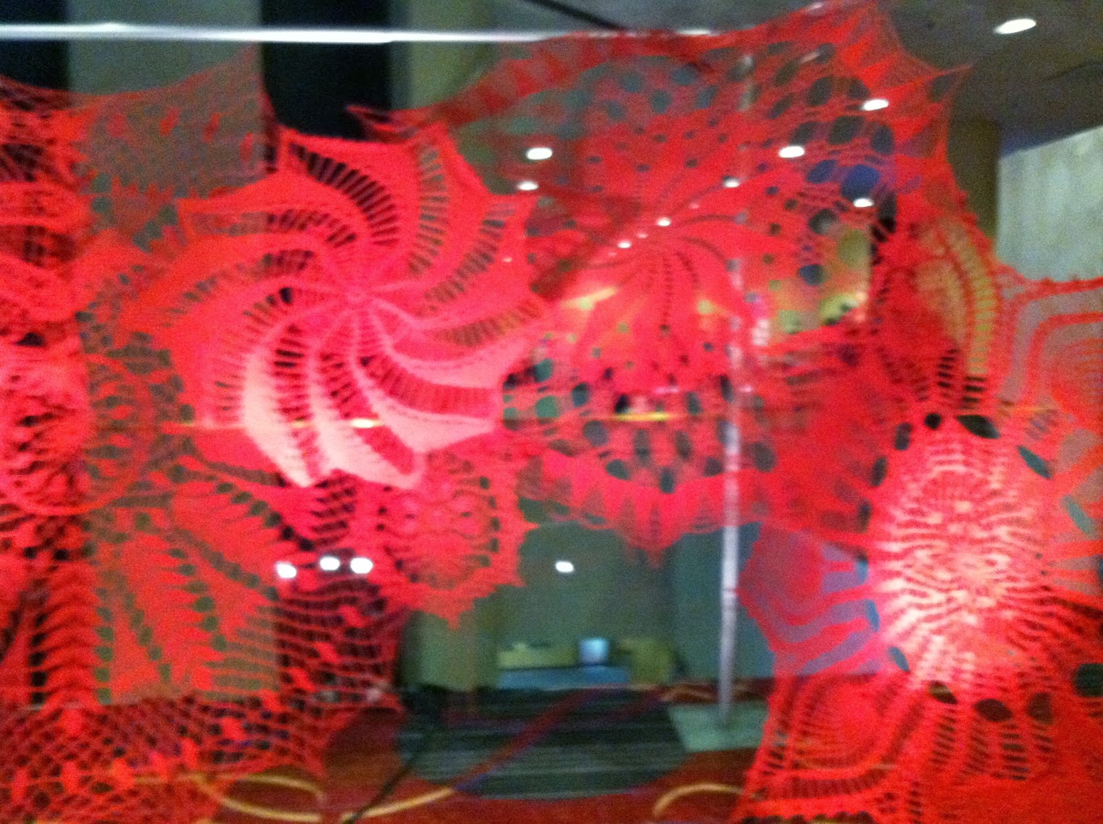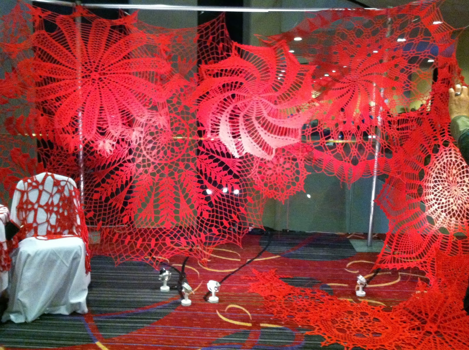 The fantastic display of red crocheted doilies by Ashley V. Blalock www.AshleyVBlalock