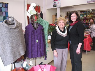 Lauren, owner of Country Yarns, trying to relax after a busy day, believe it or not, she is winding a ball of yarn, see the swift mounted on the side of the shelves. The sweater on the Right is my new design in Lucci Yarn.