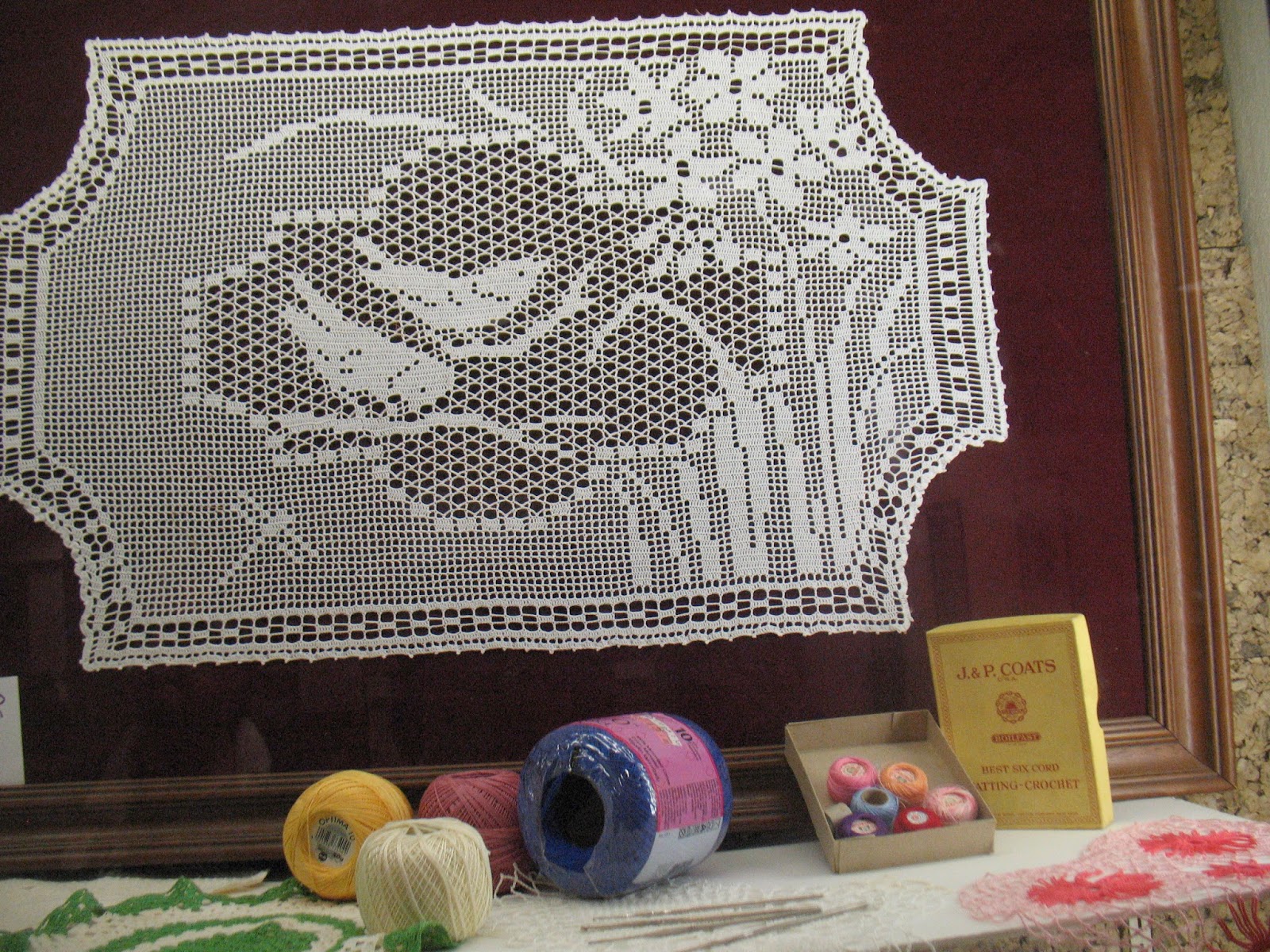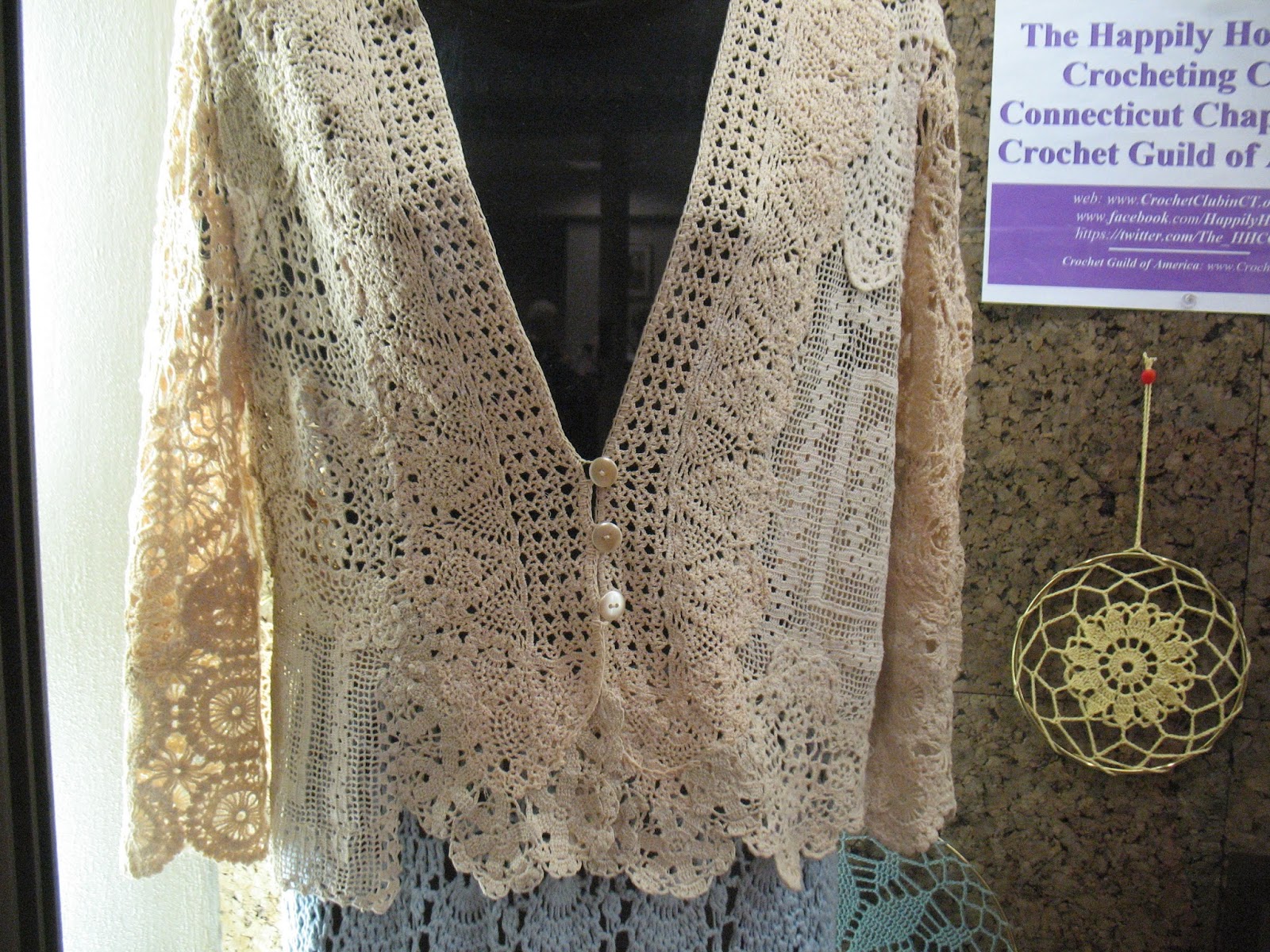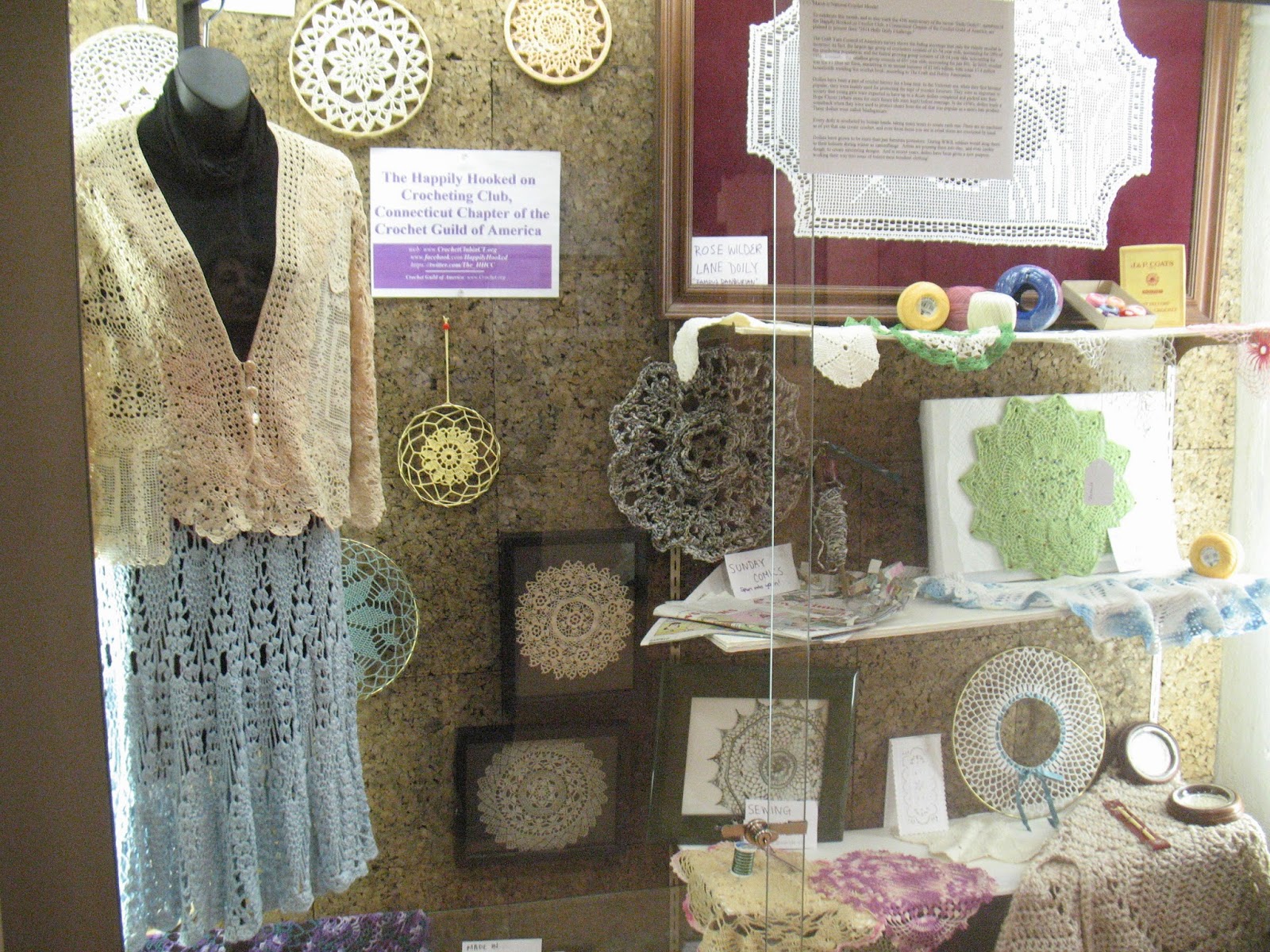 Our meeting of the Happily Hooked on Crochet Guild in CT. was such fun this month, lots of show and tell and a special exhibit on crochet doilies. Our meetings are held in the Danbury Library, and the Library has a showcase for special events, this month it was crochet. Everything is behind glass so photography is a little tricky.