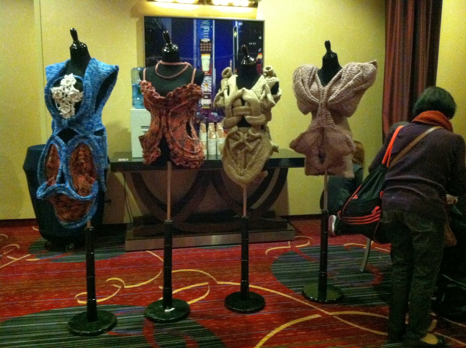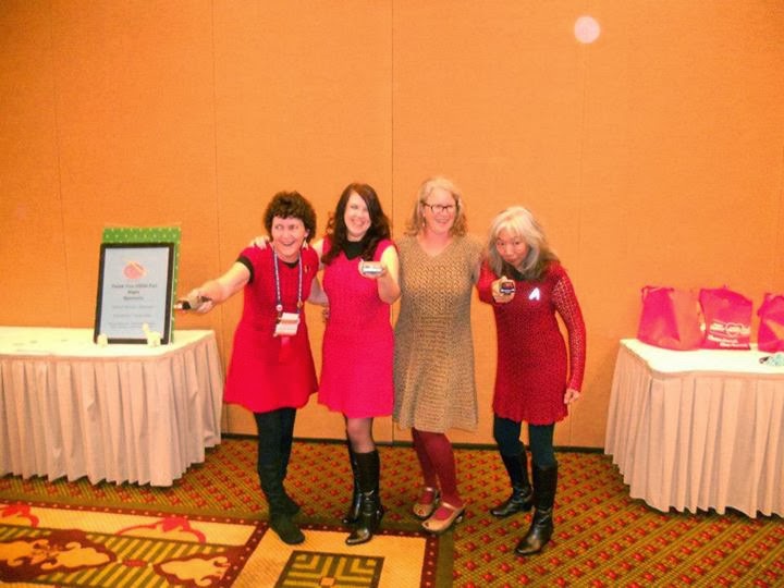 Susan Lowman, Amy Shelton, from Crochetville, Marcy Smith, from Interweave and Doris Chan at Fun Night, all wearing versions of Doris' Star Wars Dress.