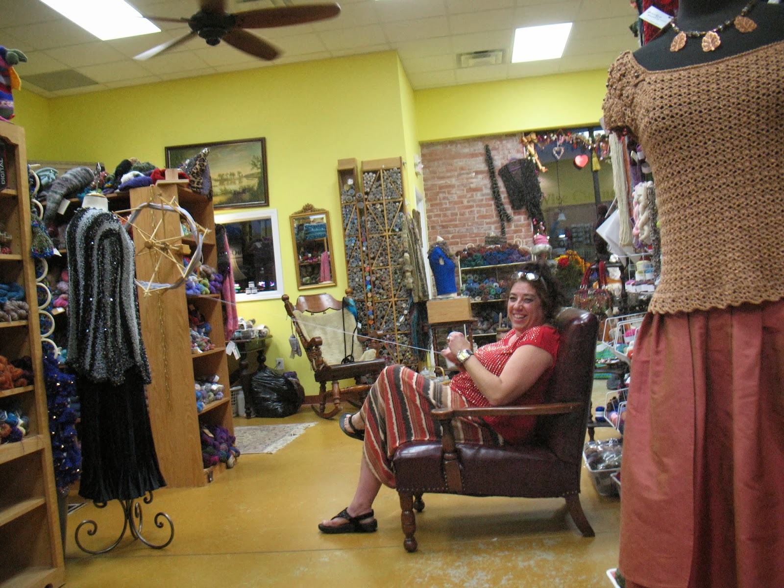 Lauren, owner of Country Yarns, trying to relax after a busy day, believe it or not, she is winding a ball of yarn, see the swift mounted on the side of the shelves. The sweater on the Right is my new design in Lucci Yarn..