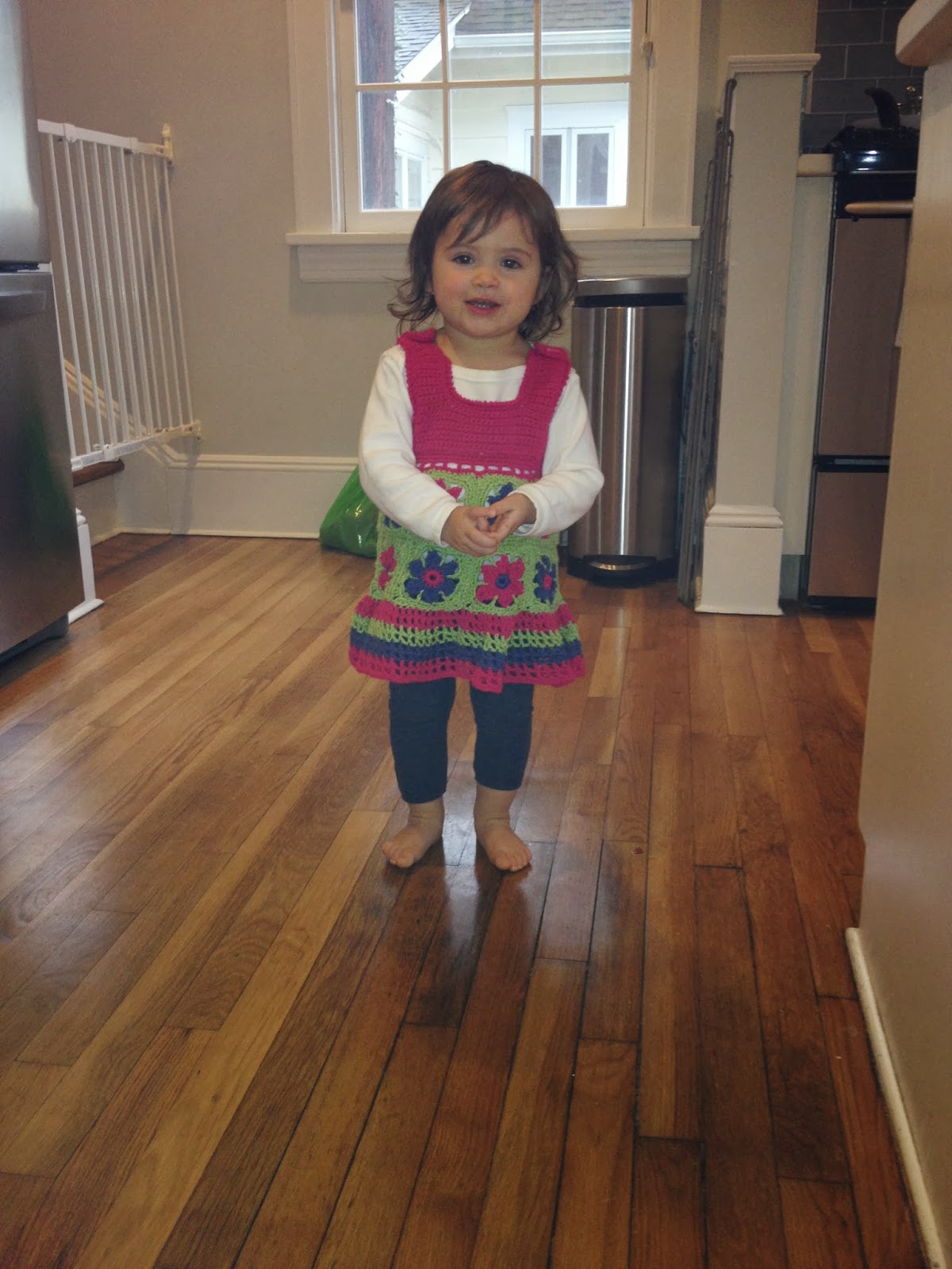 This is precious little Scarlett, wearing the jumper from my newest book, GRANNY SQUARE FLOWERS, The yarn is Red Heart Luster Sheen, and Scarlett's Grandma presented her with the jumper.