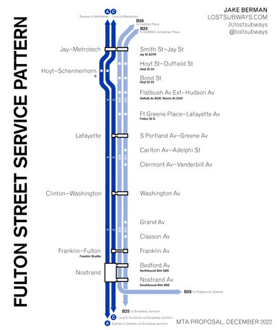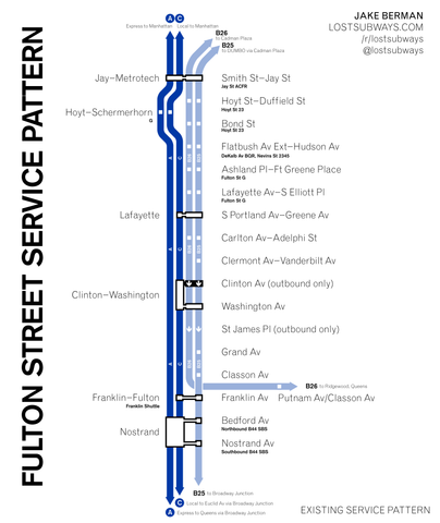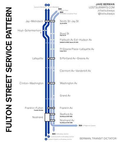 There's three additional B25 stops on the route which could also be cut to speed up the route, and this is in just two miles' worth of Fulton Street. The Hoyt-Duffield stop is only 500' (150m) from the Bond stop, the Classon Ave stop is 850' (250m) from the Franklin C station, and Carlton Av-Adelphi St stop is 600' (180m) from the Lafayette G. (GIF comparison below.)