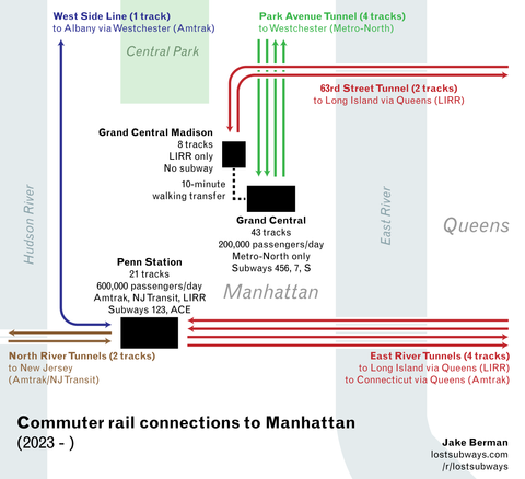 The backstory is straightforward. For over a century, NYC's commuter rail lines to the Long Island and New Jersey suburbs went to Penn Station on the West Side of Manhattan. The suburban lines from Westchester County (called Metro-North) went to Grand Central on the East Side. The two stations are about a mile apart, with no direct subway connection between the two. Penn is also in an inconvenient location, since it's at the edge of Midtown Manhattan, at 31st Street and 8th Ave. Getting to the East Side office core from Penn Station usually requires a subway transfer to the overcrowded E train. On top of this, Penn Station is the busiest transport facility in North America, and it's incredibly overcrowded. Grand Central, in contrast, *is* the center of Midtown, and it has a ton of extra passenger capacity.