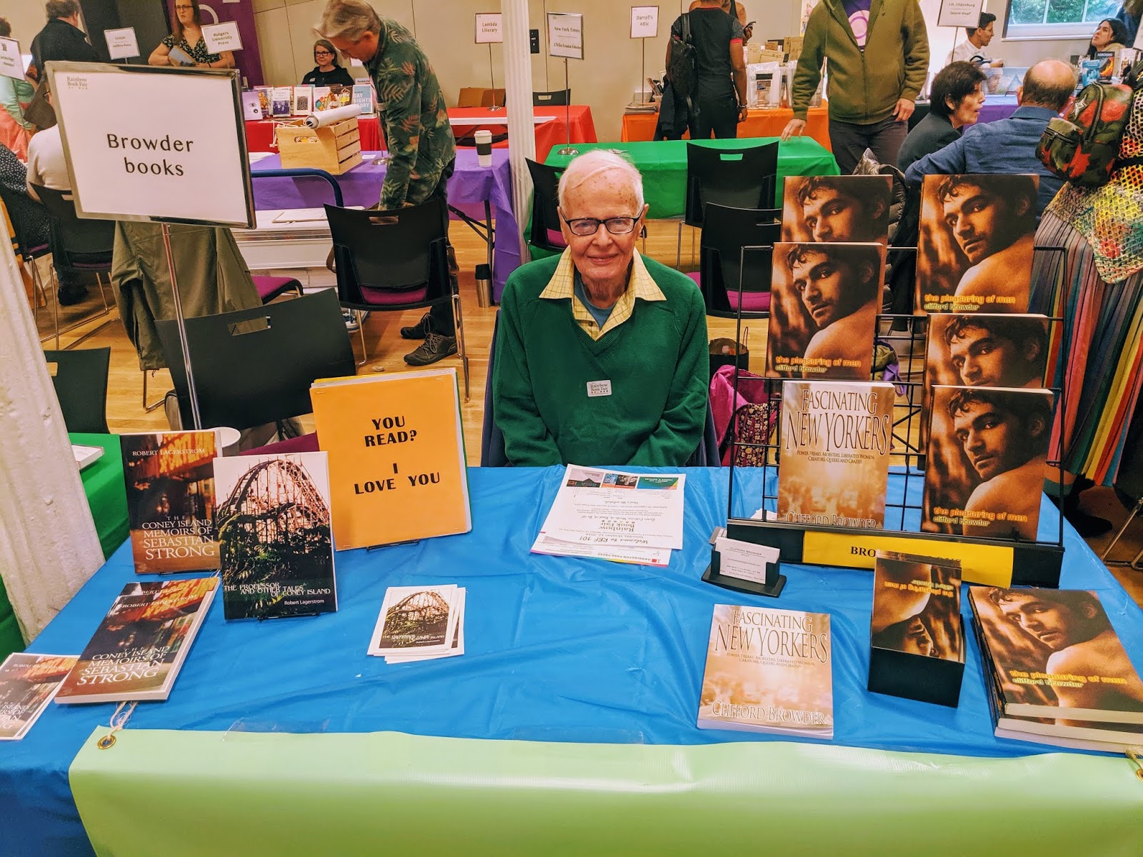 Inventory: we had sold eight books in all, four of mine and four of Bob’s: 1 Pleasuring (a measly 1!), 3 Fascinating New Yorkers, 3 Professors, and 1 Sebastian Strong. Out of 24 taken to the fair, only eight, which at first glance seemed paltry indeed. But then I did a sober calculation. For eight books at $20 each, I had pocketed $160. My table had cost $117, but the books had cost me something, too. Not Bob’s books, which I had inherited, but my own. From $160 I subtracted the cost of the table ($117) and the cost of my books ($69.27), which gave me an outlay of $26.27. O blessed Rainbow, I had almost – almost -- broken even! Just this once, in my history of book fairs, the cost is bearable, reassuring, a delight. So will I do it again? You bet!