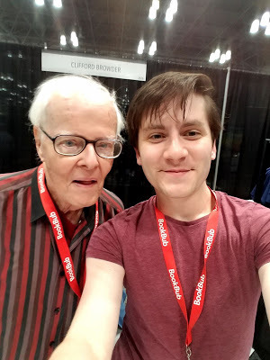 Meanwhile much was happening around us, both close by and at a distance. Every so often we would hear a great muffled roar from far away, probably a throng of excited fans responding to some event with a celebrity author. But whenever music was played, it was barely audible where we were, so I had no opportunity to display my sign GEEZERS ROCK. And when I kept seeing a long line of attendees stretching out into a hall nearby, including many older women and one with a cane, I finally went to investigate and discovered that they were waiting for a precious minute or two with a popular author of romance who was signing their books. I didn't envy that author; all those signings must have left her fingers cramped.