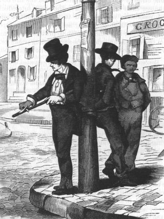 Prominent among the Bowery denizens was the Bowery B’hoy, known at a glance by his loud clothes, often the red flannel of his volunteer fire company, and by his soap-greased sidelocks topped by a stovepipe hat set at a rakish angle, with a cigar or chaw in his mouth, a black silk tie, and high-heeled calfskin boots. A butcher or mechanic by day, or a shipbuilder or carpenter or unskilled laborer, at night and on holidays he swaggered down the Bowery as if he owned it, which in a sense he did, or leaned against a lamppost with the same unmistakable air of possession. Everything about him proclaimed his rowdy independence, his hate of pretense, his disdain for bourgeois sobriety. Good-humored, loyal to his friends, and fiercely protective of his girl, he believed in fair play and a boisterous brand of chivalry, wasn’t a thug or a bully, but was always ready for a fire, a fight, or a frolic. For entertainment he was partial to prize fights and dog and cock fighting, but nothing delighted him more than a fire alarm. Hearing one, he rushed to join his volunteer fire company and help haul their engine to the scene of the fire, clashing with any rival company that got in the way, but often performing rescues of great courage and daring.
