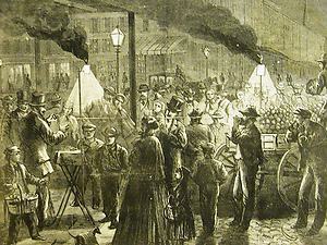 What might an enterprising commission broker with the right contacts manage to accomplish? Quite a bit, as for instance five thousand barrels of not quite prime mess pork delivered to the commissary general at a thumping price in regulation solid oak casks bound each with two iron hoops; a subcontract, bought from the brother-in-law of a captain, for six thousand overcoats of wool that he satisfied with the best cheap shoddy on the market, which, dyed sky-blue, might – or might not – turn spongy if exposed to heavy rain; and twelve thousand pasteboard and shingle-stiffened boots passed with a wink by the inspector – a smooth deal topped off afterward by a toast at the Astor House bar to the “old flag, the true flag, the red, white, and blue flag” by himself and the inspector, clinking glasses with the assistant quartermaster general. And if the boots did fall apart in the rain, he had a ready explanation to any investigating committee: "Gents, those articles were meant for the cavalry!"