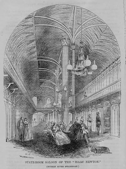 Even while engaging in Wall Street shenanigans, this homespun semiliterate whose handwriting was illegible, and who spoke with a rustic twang, was building and operating the most luxurious steamboats in the world: floating palaces designed in egalitarian America to give Everyman (and Everywoman) luxury hitherto reserved for the princely castes of the Old World. No expense was spared in their furnishings, which included ebony and satinwood paneling, grand saloons in the "Pompeian" or "Alhambric" style, Corinthian columns, mahogany balustrades, satin damask chairs, and bronze statuettes. Not only were they sumptuous and swift, but plying from New York to Albany they ran so smoothly that passengers were unaware of any motion. Speed-obsessed Americans flocked to the trains, but for comfort and ease they took the boats, enjoyed a fine meal in a dining room rivaling the best restaurants in the city, followed by a good night's sleep in a cabin, and in the morning, if their schedule permitted, a leisurely breakfast before leaving the boat. Meanwhile railroad passengers were jolted constantly and, before the advent of the dining car, were allowed limited time at periodic stops for a hasty meal in a greasy spoon.