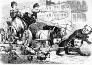 A cartoon by Thomas Nast, 1872. BE SAVED BY FREE LOVE offers Woodhull, in the garb of the Devil,as a respectable housewife toils in the opposite direction, burdened with children and an alcoholic spouse: "I'd rather follow the hardest path of matrimony than follow in your footsteps."