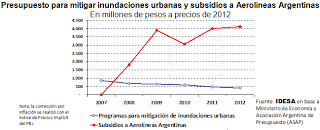 O sea: de 2007 a 2012 el estado pasó de gastar 861$ en prevención de inundaciones por cada peso que gastaba en Aerolíneas a gastar 1 centavo por cada peso. Es 8696 veces menos!