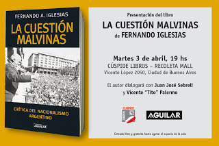 Les recuerdo que hoy martes 3 de abril, a las 19.00hs, en la Librería Cúspide del Recoleta mall presentaremos mi nuevo libro "La cuestión Malvinas- crítica del nacionalismo argentino" junto con Vicente Tito Palermo y Juan José Sebreli.