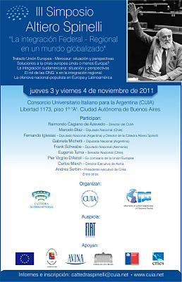 El 3 y 4 de noviembre, en la sede del CUIA, Libertad 1173, 1° A, se desarrollará el 3er Simposio Spinelli "La integración regional en un mundo globalizado", en el cual se discutirá la situación y evolución de los procesos de integración regional en Sudamérica y Europa y el desarrollo y perspectivas de la crisis europea.