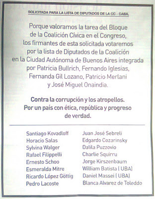 ESTA ES LA SOLICITADA APARECIDA HOY EN PÁGINA 5 DEL DIARIO CLARÍN Y PÁGINA 13 DE LA NACIÓN, EN LA QUE INTELECTUALES, ESCRITORES, ARTISTAS Y PROFESORES UNIVERSITARIOS APOYAN NUESTRA LISTA DE DIPUTADOS POR LA CIUDAD DE BUENOS AIRES.