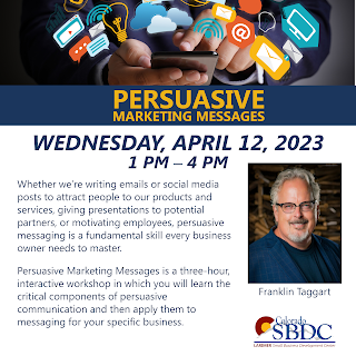 Creating sensory experiences with words.Building your power-verb vocabulary.Appealing to reason, emotion, and desire.Suggestion and imagination.Simple message frameworks.The class will be happening Wednesday, April 12, 2023, from 1-4 PM at Larimer SBDC. The cost is $25, which is a steal for all you'll receive. The class will not be recorded. Space is limited by design, so participants can get the most value from this three-hour intensive course. For information about price, location, and more, go here: https://larimersbdc.org/persuasive-marketing-messages/If you have any questions, you can also get in touch with me using the contact here on the blog.