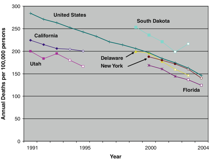 The rate fell by 9% in Florida, but rose by 9% in South Dakota. The total smoking ban in New York was followed by a fall in AMI mortality of 12%, but this was not significantly different from the 10% decline seen nationwide.