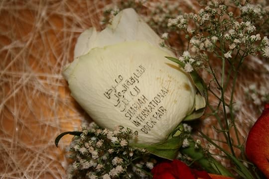 have to walk, I'm driving!) to a little lounge where we waited for our paperwork to be done. A gentleman in pristine white dishdasha emerged from the door carrying a bouquet of flowers to welcome me to Sharjah. Julia Roberts step aside! Very curiously, each rose was stamped with the book fair brand.
