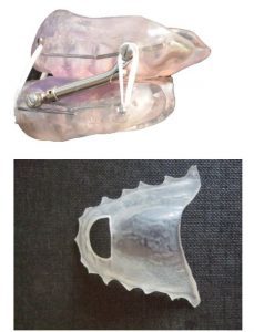 Below are pics of the oral appliance (top, a mandibular advancement device) and placebo (bottom, a thingy that just sits at the roof of the mouth, if I’m understanding the text) used in the study. What surprised me (because I just haven’t stumbled across it yet) was just how little the lower jaw is thrust out by a mandibular advancement device such as this: a mean of about 7mm in this study.