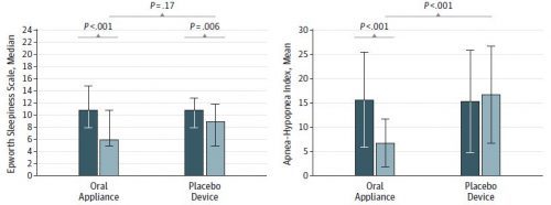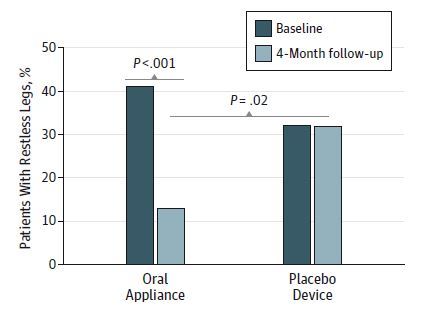 The conclusion: “A custom-made, adjustable oral appliance reduces obstructive sleep apnea, snoring, and possibly restless legs without effects on daytime sleepiness and quality of life among patients with daytime sleepiness and snoring or mild to moderate sleep apnea.”