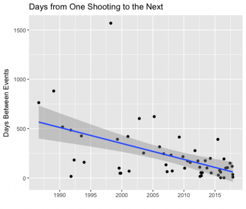 What has happened is that in the 50 days since Las Vegas there have been two more shootings that killed five or more people (San Antonio, TX, and Rancho Tehama, CA). If you sense that such shootings are becoming more frequent you are correct. The Figure below plots the number of days between successive mass shootings. The time between successive mass killings is decreasing. Alternatively, we can say that the frequency of mass shootings is steadily increasing.*