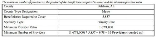 This is rather abstract. How about a concrete example? Sure! The following tables should help. The first illustrates the calculation of the number of primary care providers a plan in Baldwin, AL must contract with (10) for 5,857 beneficiaries.
