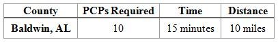The next table shows that in Baldwin, AL, at least one primary care provider must be within 10 miles and 15 minutes of travel time for 90% of beneficiaries in the county. Additionally, a PCP who is not within the time and distance requirements of at least one beneficiary, will not count towards the minimum number of providers required. Moreover, because at least 90% of beneficiaries must be within the time and distance requirements, a plan may have to contract with more than the minimum number of providers required to meet these requirements.