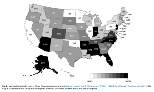 Are these findings credible? These are complicated analyses with many moving parts. A lot hangs on the idea that you can make an “everything else being equal” comparison between states based on how they administered Medicaid. Looking at the map above, there are regional correlations in when states started Medicaid, and there are likely correlations with state poverty and other factors. Yet even within regions, there is variation in when Medicaid started and how it was run. The papers I’ve summarized look for this kind of variation in Medicaid coverage policies between comparable states. This variation allows them to infer that Medicaid coverage during early childhood caused these better child and adult outcomes. It’s a large claim and it’s certain to be disputed.