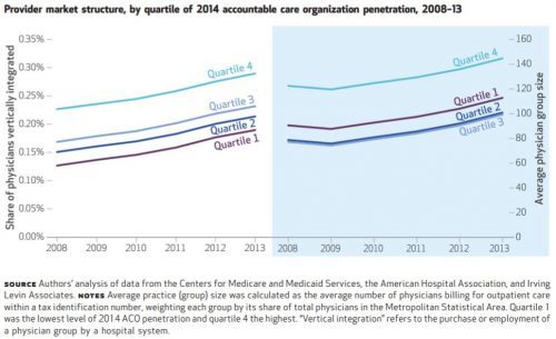The chart, just below, summarizes the main findings. Though vertical integration of physicians with hospitals (left panel) and physician group size (right panel) both increased over the study period, the rate of growth for both was identical across quartiles of 2014 ACO penetration. Here, ACO penetration is measured at the metropolitan statistical level as the proportion of Medicare beneficiaries attributed to an ACO.