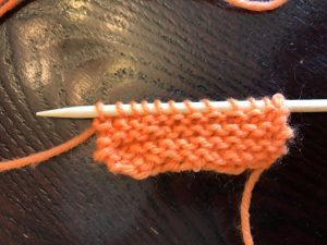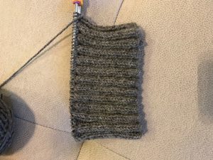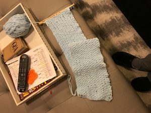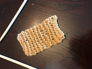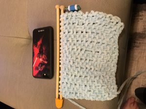 I figured this would be a good “first” project. I went wide – at least six inches – and chose a “seed” stitch. That’s just alternating knits and purls the whole way. It’s reversible, and I thought it would look nice. Off I went. The problem was, though, that I wasn’t yet good enough to recognize which were knits and which were purls. I had to rely on counting and memory where I was. Also, I wasn’t great yet at fixing my mistakes. I had many moments of panic. But I made progress: