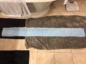 Blocking is taking your finished product and soaking it in tepid water (and I added this soapy stuff the women recommended) for a period of time. Then you rinse and gently squeeze out the excess liquid. You roll the knitted project in a towel to dry it more. Then you stretch it out, or mush it together, to be the exact shape you desire at the end. Here’s the scarf blocked out: