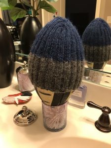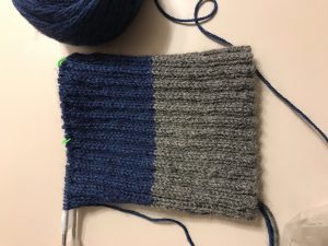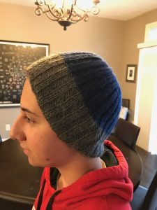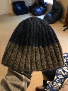 A hat requires you to knit in the round. The first reason is that you need to make a circle, not a flat row. The second reason is that a hat’s diameter is usually longer than any straight needles could hold. You use round needles, which are shorter needles connected by a wire, so that each time you transfer a stitch from left to right, it starts to travel around the circle back to the left tip. You never knit from the right needle to left. I did this is 2×2 ribbing, which means that you do 2 knits, 2 purls, repeat – all the way around. Ribbing is good for hats because it stretches nicely. I was pretty proficient at this point, and made rapid progress: