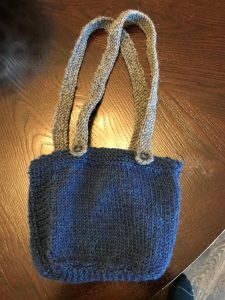 That’s after blocking on a shoebox lid. Note the detail where I attached the straps to the body. I think the inch of garter makes a nice contrast to the stockinette, too. Well done, Stitch ‘n Bitch! Here is the bag in its natural habitat: