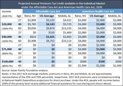 As you can see from this handy chart from the KFF, a 27-year-old will get $2000, a 40-year-old will get $3000, and a 60-year-old will get $4000. That’s true if they make $20,000 or $75,000. Under the ACA, they got more money if they were poorer, and less if they were richer. Those making $75,000 get nothing now, for instance.