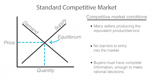 As with any exchange of goods and services, the standard competitive market model has the familiar upward sloping supply curve and downward sloping demand curve, illustrating that when prices are higher, demand decreases and supply increases as sellers are incentivized to produce more of that good or service at its higher price. Sellers and buyers arrive at what quantity to produce and consume and at what price based on where these two lines intersect, called the equilibrium. Both buyer and seller are happy with the deal they’ve struck!