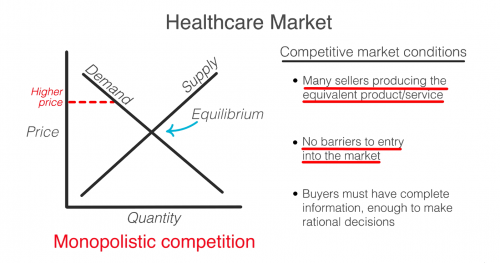 To start, it’s true that healthcare is failing the market standards when it comes to competition. The number of sellers in the market is decreasing due to both an increase in barriers to entry and due to consolidation, including hospital mergers. This causes an imbalance in power of the seller over the buyer that can begin to reflect what economists call monopolistic competition where sellers can charge a price above the perfect competition equilibrium. In the extreme, when there is only one seller, the market is a monopoly.