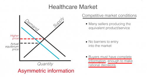 Another failure is that consumers in healthcare, patients, do not have all the information that providers, like doctors and hospitals, do. This is known as asymmetric information. Patients often have no idea before getting care how much it will cost, what the prices available to them elsewhere are, or what the quality will be. When consumers are in the dark about these basic features, the true demand and supply will be different than the model. The true demand may be lower if patients knew ahead of time how much it cost or how much less valuable the service is compared to how it is promoted. This means prices can be set higher than they likely would be if the true demand was known.