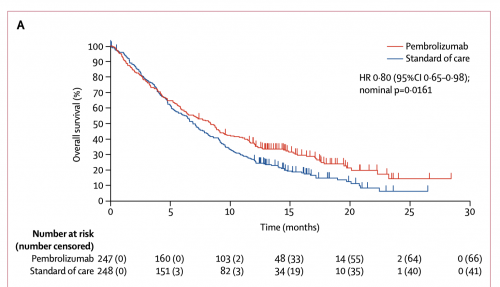 Notice that half of the pembrolizumab patients are dead by 9 months. Pembrolizumab does better relative to standard care. But in absolute terms, the treatment doesn’t accomplish much.