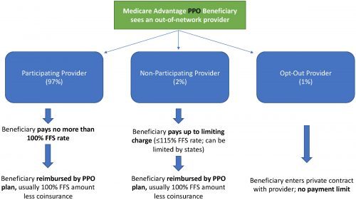 MA PPO plans operate slightly differently. By , there are built-in benefits covering visits to out-of-network physicians (usually at the expense of higher annual deductibles and co-insurance compared to HMO plans). Like with HMO enrollees, an out-of-network Medicare-participating physician will charge the PPO enrollee no more than the standard FFS rate for their services. The PPO plan will then reimburse the enrollee 100% of this rate, less coinsurance. (See Figure 2.)