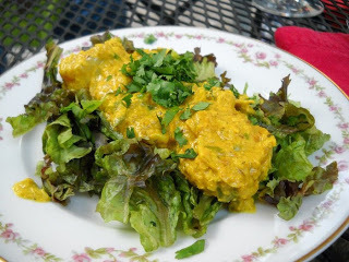Now toss your salad in a simple lemony vinaigrette. Plate up the salad forming beds. Top with shrimp and curry sauce. Serve with nan or pita bread, or nothing at all. Oh, nearly forgot. Once plated, sprinkle the chopped coriander over the shrimp.