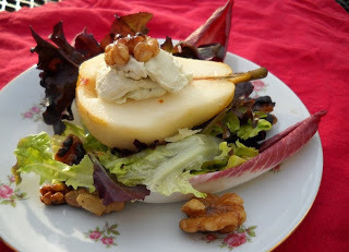 Here's a refreshing, very simple starter to add to your repertoire. The Stilton cheese make this a very proper English dish. This recipe is enough for at least four servings, with a half a pear per guest. Of course, you might like this so much you'll need a whole pear!