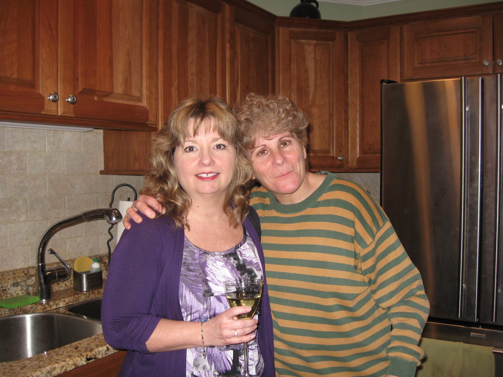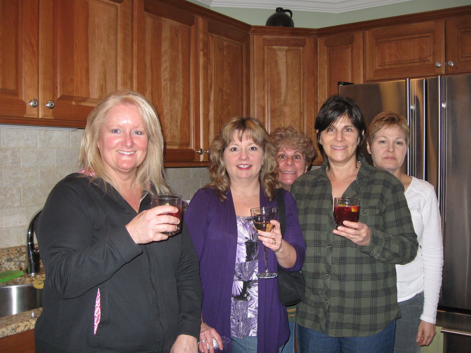 Meanwhile, the rest of the gang arrived (pictured with their heart-healthy wine and sangria glasses: Marcie, Marty, Allison, Claudia and Dori) and, between them, brought apple strudel, spinach quiche, spaghetti squash with Italian sauce, pesto pasta, hazelnut-chocolate pie, marzipan/almond cookies...and more! No doubt about it, we had a fabulous feast.