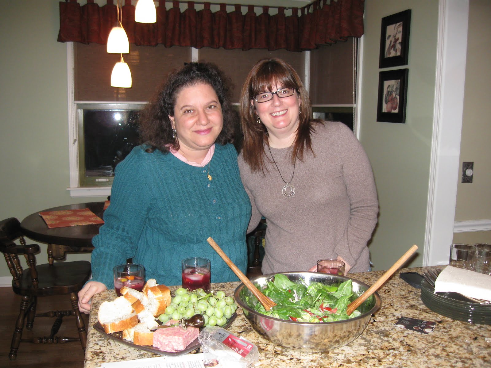 Chris and I above were holding court over the extremely healthy side of the kitchen (gorgeous salad! fruit and cheese plate!), and Marty and Allison, to the right, were getting out the wine and the sangria (!!) while the final touches were being added to some of the other dishes. For the book discussion of A Summer in Europe, it was decided by the president (Allison) and the member who chose the novel (Lisa) that everyone attending should bring/make a dish from somewhere in Europe and, if they had pictures of one of their personal European trips, to bring those along, too.