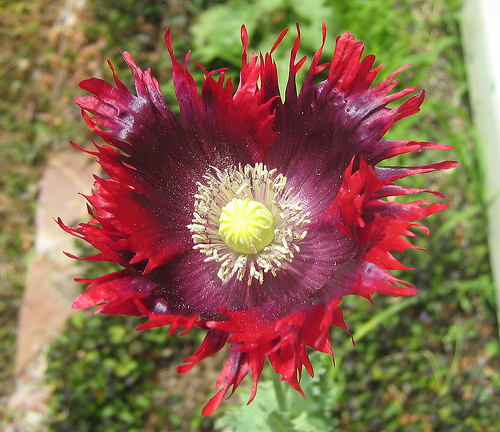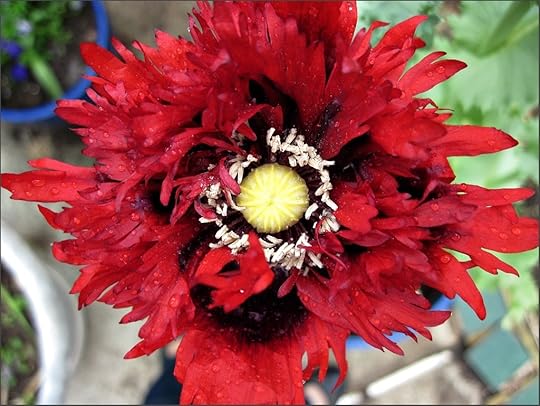 Poppy, Drama Queen. Surreal 4" flowers on a 4' tall plant. If I were making a movie about a utopian future, this would be part of the landscape. The problem, alas, with poppies is that they bloom for just a few weeks and then look like crap for the rest of the year. So you might want to buy a 4" pot of it and one of Poppy Naughty Nineties mentioned below from Annie's Annuals, let 'em bloom and when seed pods form, harvest the seeds, save 'em in dry place, then plant 'em in 3-4" pots in November or December and come spring, you'll have brand new plants plus plenty to give away.
