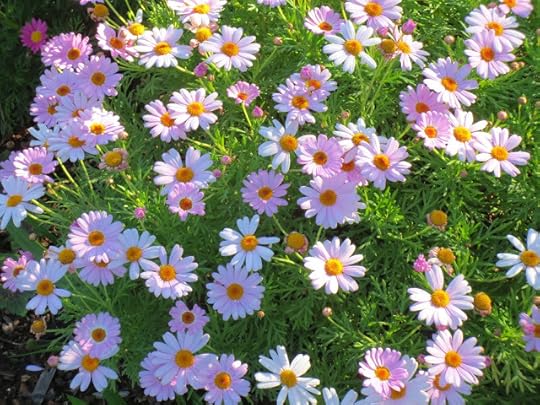 Argyranthemum, Comet Pink. These are classic daisies but in clear pink, in profusion, constantly for eight months in a row. Best of all, they completely cover the 2-foot wide symmetrical mound. By November or December, they get leggy, so take cuttings, dump the plants, and in early spring, plant the rooted cuttings.