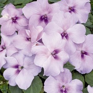 Impatiens, Xtreme Lavender. (if your area doesn't get downy mildew). There are many other great impatiens in the Xtreme series and the Accent series, but I find this color particularly attractive. And the plants are vigorous, quickly growing into a 8"-tall mound.