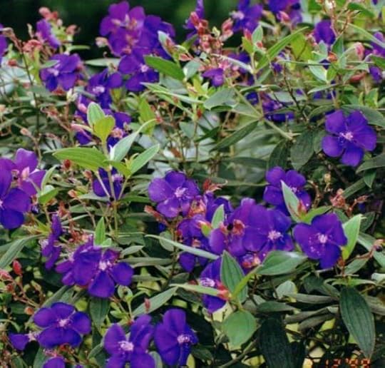 Tibouchina. The flower is a gorgeous and unique royal purple, which cover 6-8 foot shrubs for months at a time.