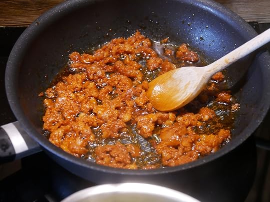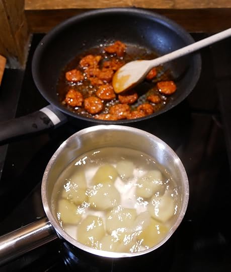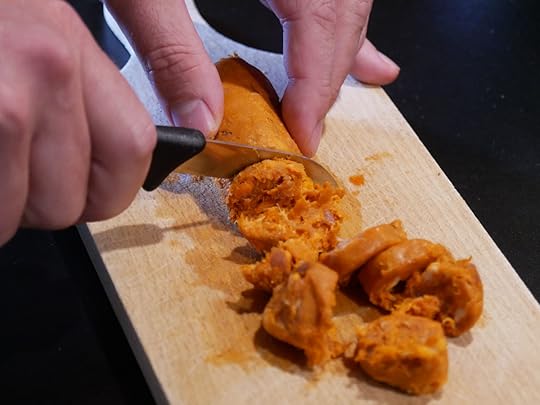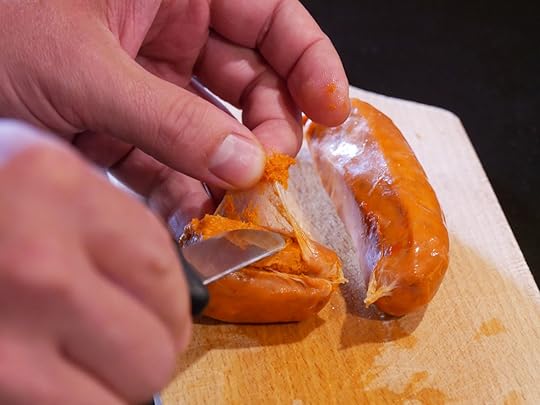 Chorizo ląduje na patelni, gdzie na małym gazie (lub małej mocy kuchenki elektrycznej) powoli będzie się wytapiać tłuszczyk. Żadna oliwa ani olej nie jest potrzebna.