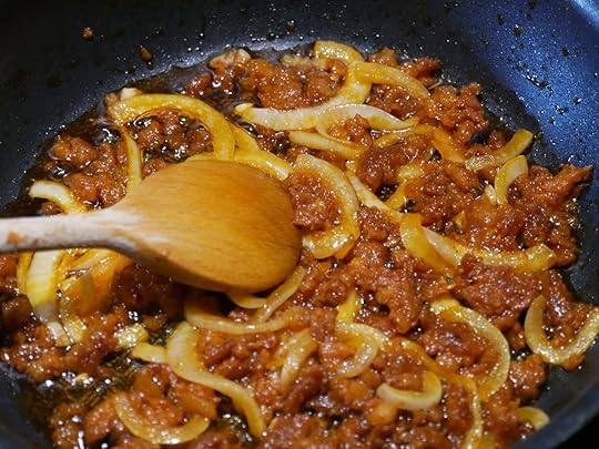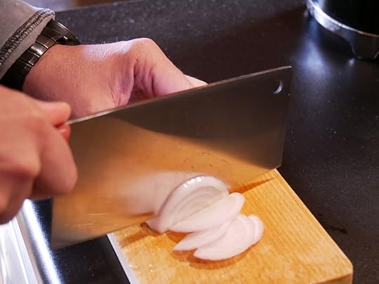 Cebulę kroimy raczej grubo. To znaczy, pokrójcie, jak chcecie. Ja do tego dania kroję grubo.