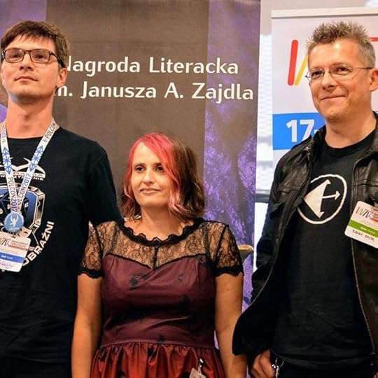 Różaniec otrzymał nominację do Nagrody Literackiej Janusza A. Zajdla. Dziękuję wszystkich, którzy na mnie głosowali. Gratuluję pozostałym nominowanym: Ani Kańtoch i Arturowi Olchowemu (oboje na zdjęciu obok mnie), oraz Marcie Krajewskiej, Pawłowi Majce. Nominowani za opowiadanie to Leszek Bigos, Dawid Cieśla, Marta Kisiel, Magdalena Kucenty oraz Przemysław Zańko.
